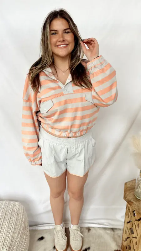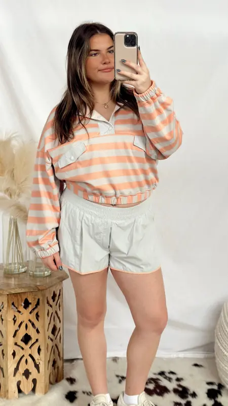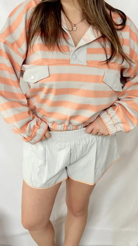 Effortlessly chic and undeniably versatile, The French Stripe Top brings timeless style to your everyday rotation. Featuring classic grey and salmon stripes, this long-sleeve beauty showcases charming button-up details at the neckline and functional front pockets for practicality. The cinched waistband creates a flattering silhouette that works beautifully dressed up or down. Perfect for layering or wearing solo, this striped essential is your new go-to piece for looking put-together without trying too hard.