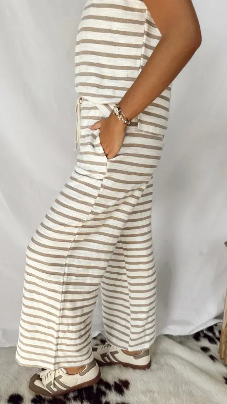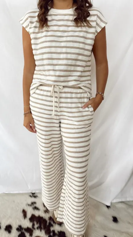 The Terra Pants bring effortless style with their charming cream and taupe stripe pattern. Designed with an adjustable waistband, these pants adapt to your comfort throughout the day—no more tugging or shifting.